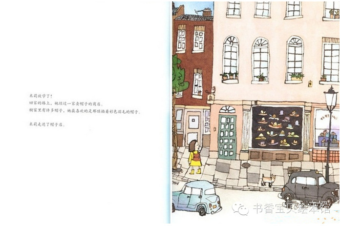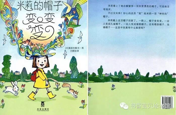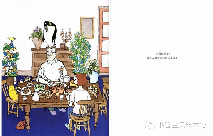 看见爸爸和妈妈的时候,米莉问:“你们喜欢我的帽子吗?”“帽子?”妈妈说,“没有看到啊!”突然,妈妈停了一下,微笑着说“哦!真是一顶很神奇的帽子,我真希望自己也有这样的帽子呢!”米莉:“你有啊!你只要想象,它就会戴在你的头上。”