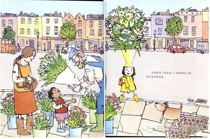 米莉经过一家花店——她的帽子上插满了美丽的花朵。