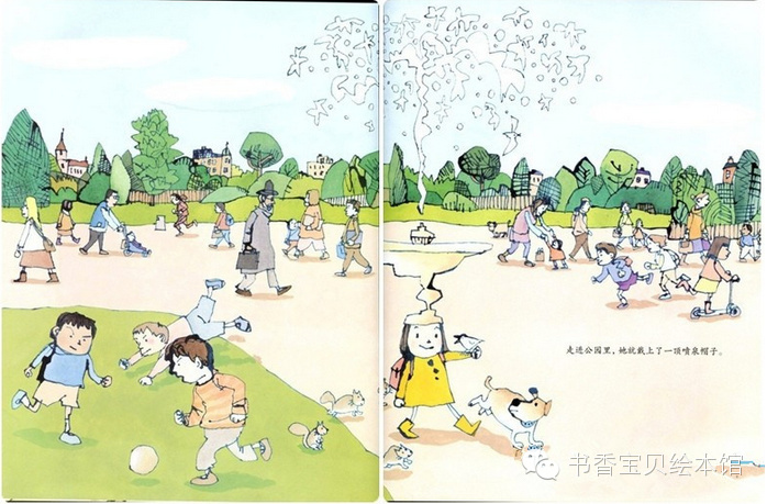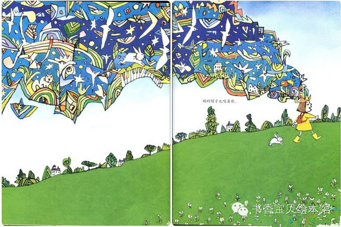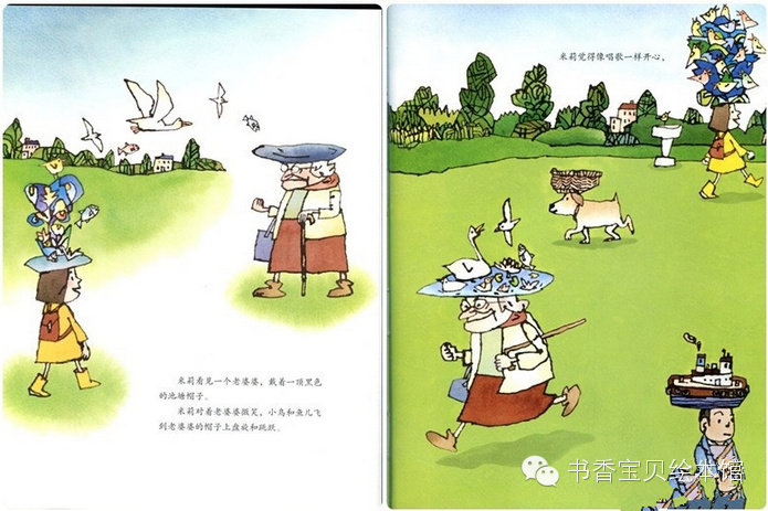 米莉看见一个老婆婆,戴着一顶黑色的池塘帽子。米莉对着老婆婆微笑,小鸟和鱼儿飞到老婆婆的帽子上盘旋和跳跃。