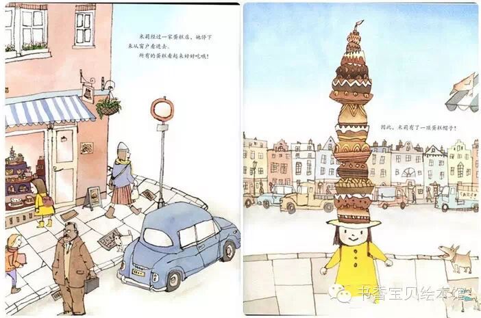 米莉经过一家蛋糕店,她停下来从窗户看进去!所有的蛋糕看起来好好吃哦!
