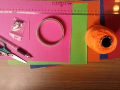 活动准备:1各色卡纸、剪刀、双面胶、牙签、细绳子、小铃铛、笔、尺子