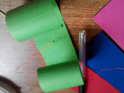 3把剪下来的卡纸进行对折,用牙签在中间通个洞。