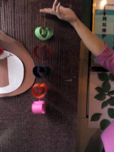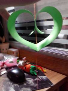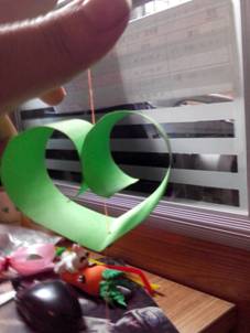 最后请小朋友把所有的心形做好串起来,心形风铃就做好了!感恩节,你是想送给妈妈还是爸爸呢?或者一起送。