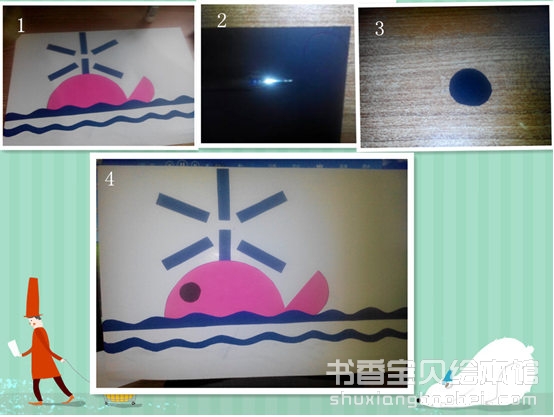 4把黑色的圆形粘贴好,鲸鱼的眼睛就完成了。