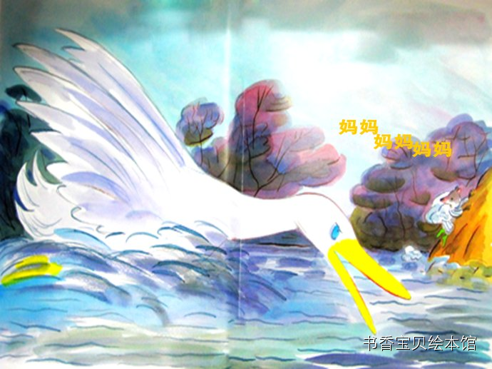 “瞧,一块奶油点心!”一只鸭子嘎嘎叫着,他追着鼠小小——啄啄啄!更多的棉花掉下来了。“妈妈快来帮帮我!”鼠小小拼命的游啊游,他爬上了岸,全身湿透了。