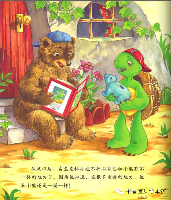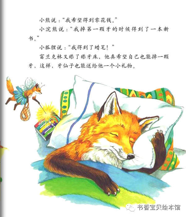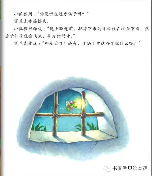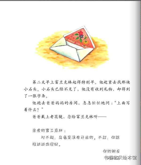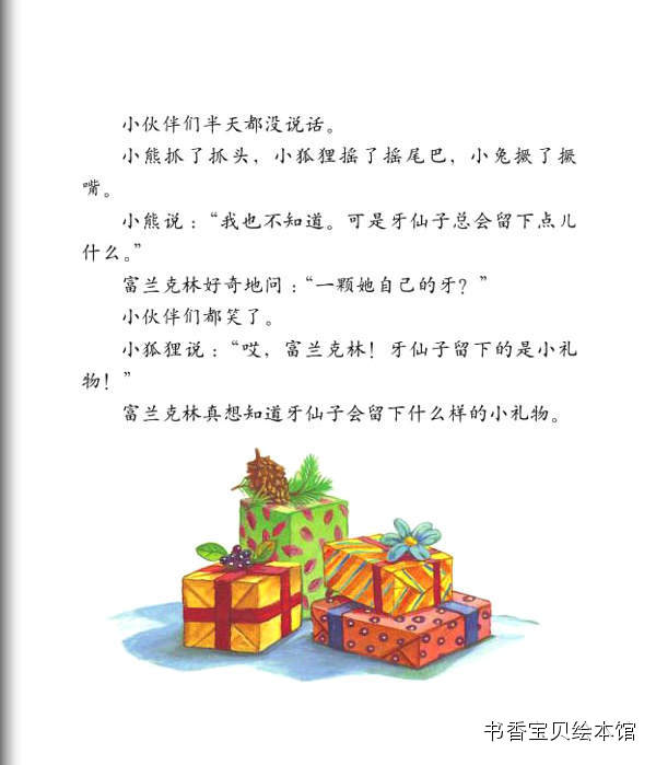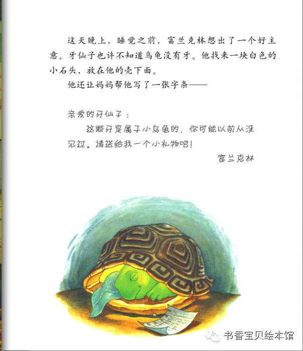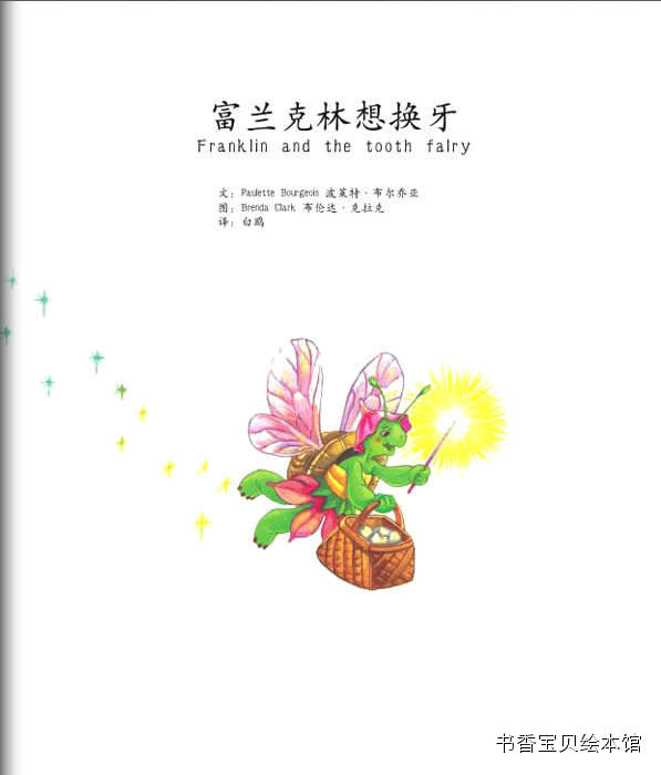 【内容介绍:】 童话故事是这样开始的:富兰克林的朋友中,最要好的是年龄跟他一样大小熊。 有一天,小熊的一颗牙齿松动了,他伸手到嘴里摇一摇,拽一拽,结果拽出了一 颗沾着血的牙齿!富兰克林惊讶极了,觉得挺可怕的。小熊自己倒是一点儿都不 怕,他还挺高兴的,他把牙齿放在手掌心,凑近富兰克林让他看,说“这是我掉 的第一颗牙齿!”童话故事中小熊告诉他,这颗牙齿已经松了,松了的牙齿只有 掉出来才能给新牙腾出地儿来哦。富兰克林舔了一下自己的牙床,滑溜溜的,他 告诉小熊:“我没有牙齿。”小乌龟竟然没有牙齿?!呵呵,这下轮到小熊惊讶 了。不止小熊,小伙伴们全都觉得富兰克林没有牙齿,这是件多么奇怪和糟糕的 事情!看到小熊把牙齿包的好好的放起来,富兰克林更好奇了,不是要长新牙了 吗?为什么这颗已经掉了的牙齿,还要保存起来呢?小伙伴们都惊讶富兰克林竟 然不知道牙仙子的童话故事,于是一点点解释给他听。原来,如果小朋友掉了牙 齿,睡前把这颗牙齿包好放在自己的枕头下面,第二天就会发现牙齿不见了,因 为晚上等你睡着了,牙仙子会悄悄的飞过来,把牙齿带走了。而且,还会送一个 礼物给你。说到礼物,大家都挺兴奋的,纷纷回忆自己掉牙时的情景。童话故事 中富兰克林羡慕极了,他好想也掉一颗牙齿,然后牙仙子飞过来带走牙齿,送一 个小礼物给他。学校里,猫头鹰老师看到小熊掉的牙齿,很开心的告诉他,换了 乳牙就意味着你不是小孩子啦,你已经长大咯!富兰克林默默地站在旁边,他甚 至有点伤感起来,为什么小乌龟没有牙齿啊,我多想也尝一尝掉乳牙和长大的滋 味!他看着窗外,闷闷不乐。这种情绪一直持续到回了家,妈妈关心的问候,得 知他是为自己没有牙齿而遗憾,不由得乐了。爸爸说,我们乌龟家族都是没有牙 齿的哦!富兰克林伤心的说,我好想长出一颗牙齿!大家换乳牙的时候都能得到 牙仙子送的礼物,我却什么都没有。富兰克林突然眼前一亮,他想到了一个好主 意,他觉得牙仙子也许根本不知道乌龟有没有牙齿,所以,睡觉前,他给牙仙子 留了一张字条......可是第二天,富兰克林并没有如愿收到牙仙子的礼物,却发 现了一张纸条,爸爸念给他听:亲爱的富兰克林,对不起,乌龟是没有牙齿的。 不过,你这样试试也好。署名是:你的朋友牙仙子。虽然得到了童话故事中牙仙 子的回应,富兰克林却高兴不起来,接着他在餐桌上发现一个大包裹,爸爸妈妈 说,打开它,这是我们送给你的,祝贺你长在长大!富兰克林说谢谢爸爸妈妈, 然后迫不及待的打开礼物,里面是一本精美的书。这下富兰克林不再愁眉苦脸了 ,因为就算没有牙齿,他也会长大。