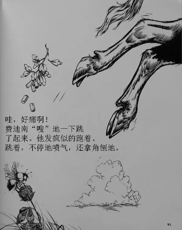 哇,好痛啊,费迪南“嗖”地一下跳了起来,他发疯似的跑着,跳着,不停的喷气,还拿角刨地。