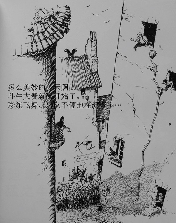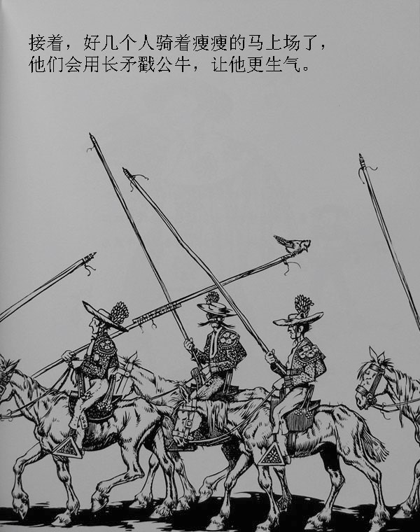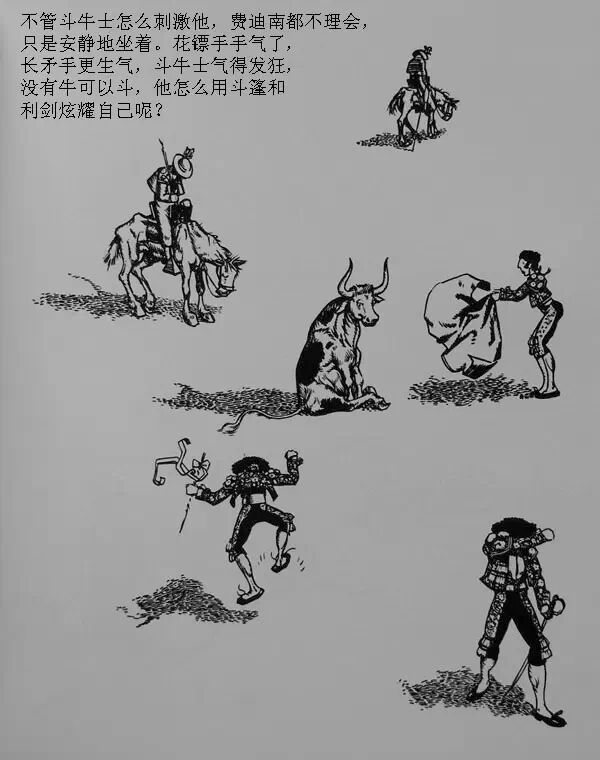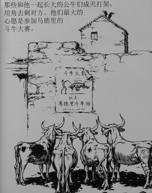 那些和他一起长大的公牛们整天打架,用角去刺对方,他们最大的心愿是参加马德里的斗牛大赛
