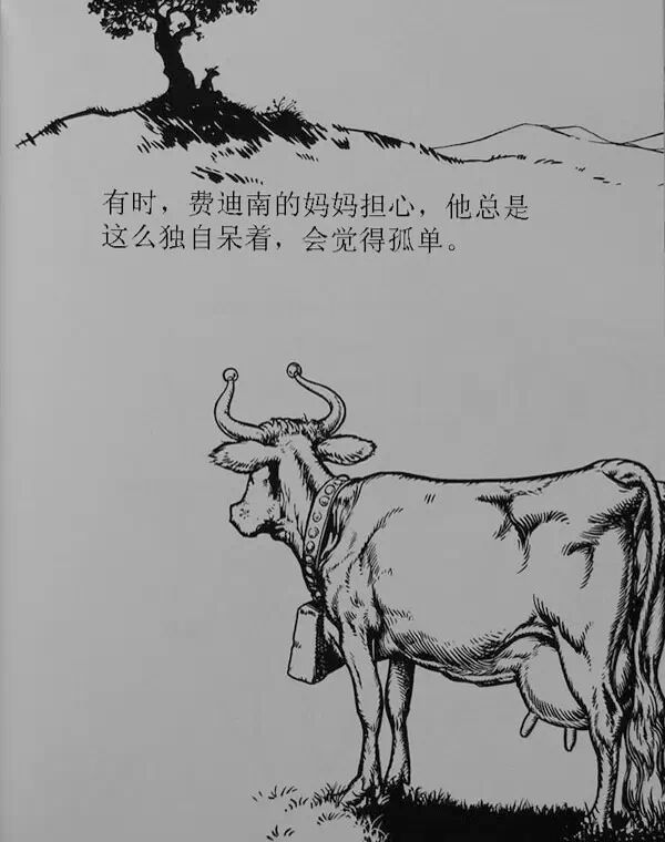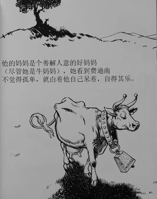 他的妈妈是个善解人意的好妈妈(尽管她是牛妈妈),他看到费迪南不觉得孤单,就由着他自己呆着,自得其乐。
