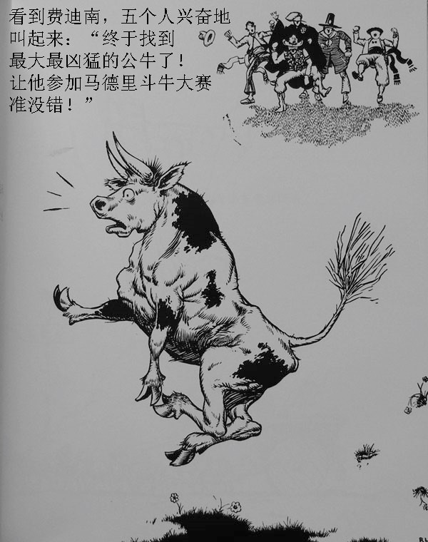 看到费迪南,五个人兴奋地叫起来:“终于找到最大最凶猛的公牛了!让他参加马德里斗牛大赛准没错”
