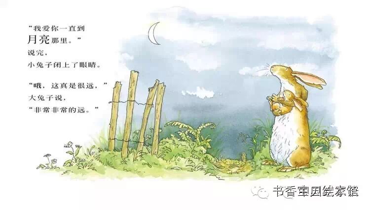 这可真远,小兔子想,他太困了,想不出更多的东西来了。他望着灌木丛那边的夜空,没有什么比黑沉沉的天空更远了,说“我爱你一直到月亮那里。”大兔子低下头来,亲了亲小兔子,对他说晚安,然后微笑着轻声说:“我爱你一直到月亮那里,再从月亮上,回到这里来。”