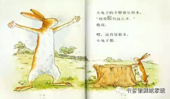 “我跳得多高就有多爱你。”大兔子也笑着跳起来,他跳得这么高,耳朵都要碰到树枝了。这真是跳得太棒了,小兔子想,我要是能跳得这么高就好了。“我爱你,像这条小路伸到小河那么远”,小兔子喊起来。“我爱你,远到跨过小河,再翻过山丘”,大兔子说。