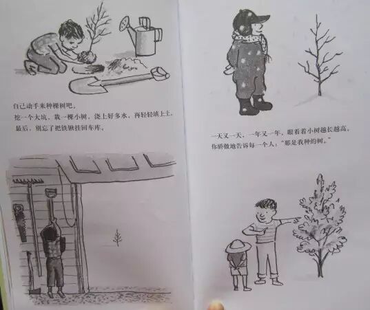 挖一个大坑,栽一棵小树,浇上好多水,再轻轻填上土。