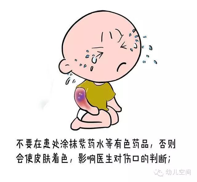 2.不要在患处乱涂抹药物。不要在患处涂抹紫药水等有色药品,否则会使皮肤着色,影响医生对伤口的判断;