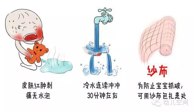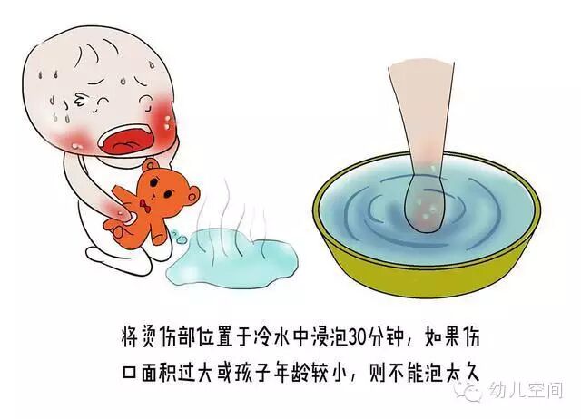 2.如果烫伤处出现水疱,不建议用冷水冲洗,以免水疱破裂。可将烫伤部位置于冷水中浸泡30分钟,如果伤口面积过大或孩子年龄较小,则不能泡太久。